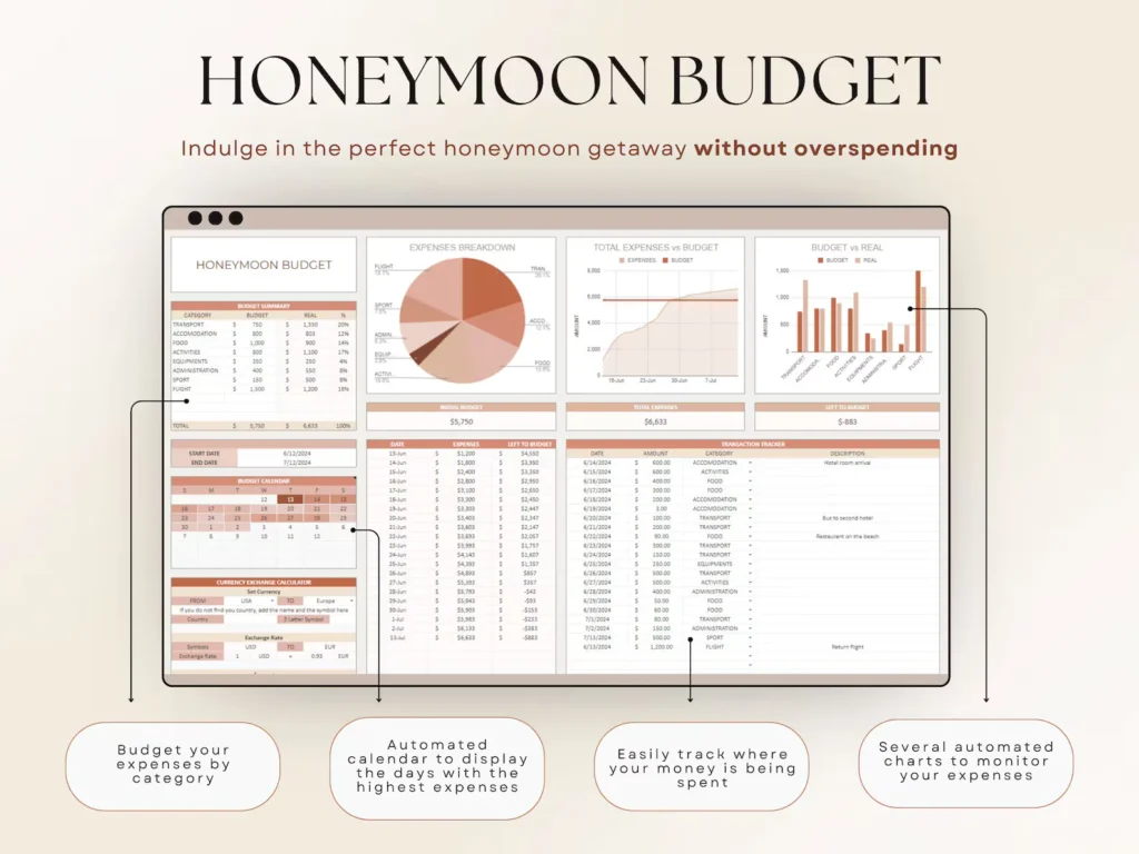 Absolutely! The planner includes vendor tracking, venue comparisons, currency exchange calculator for international trips, and comprehensive travel planning.